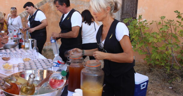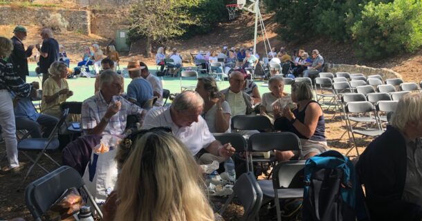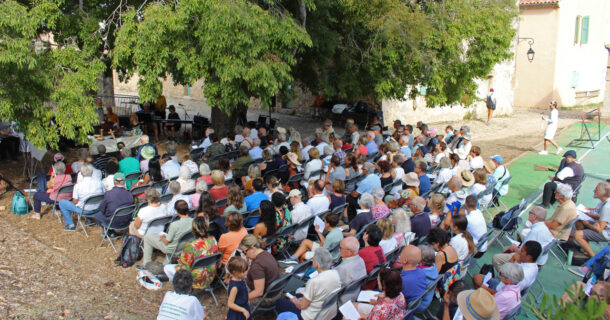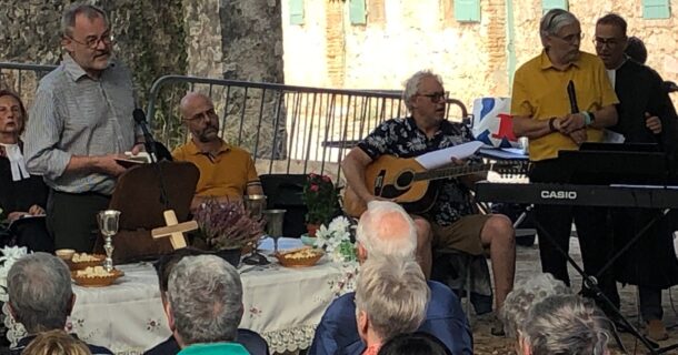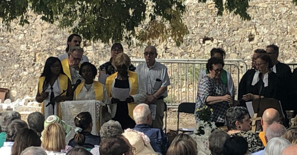 Culte sous le micocoulier, croquis de Marie-Christine Jestin. Les versets inscrits rappellent les textes de la prédication (Ac 5 et 2 Tm 1).